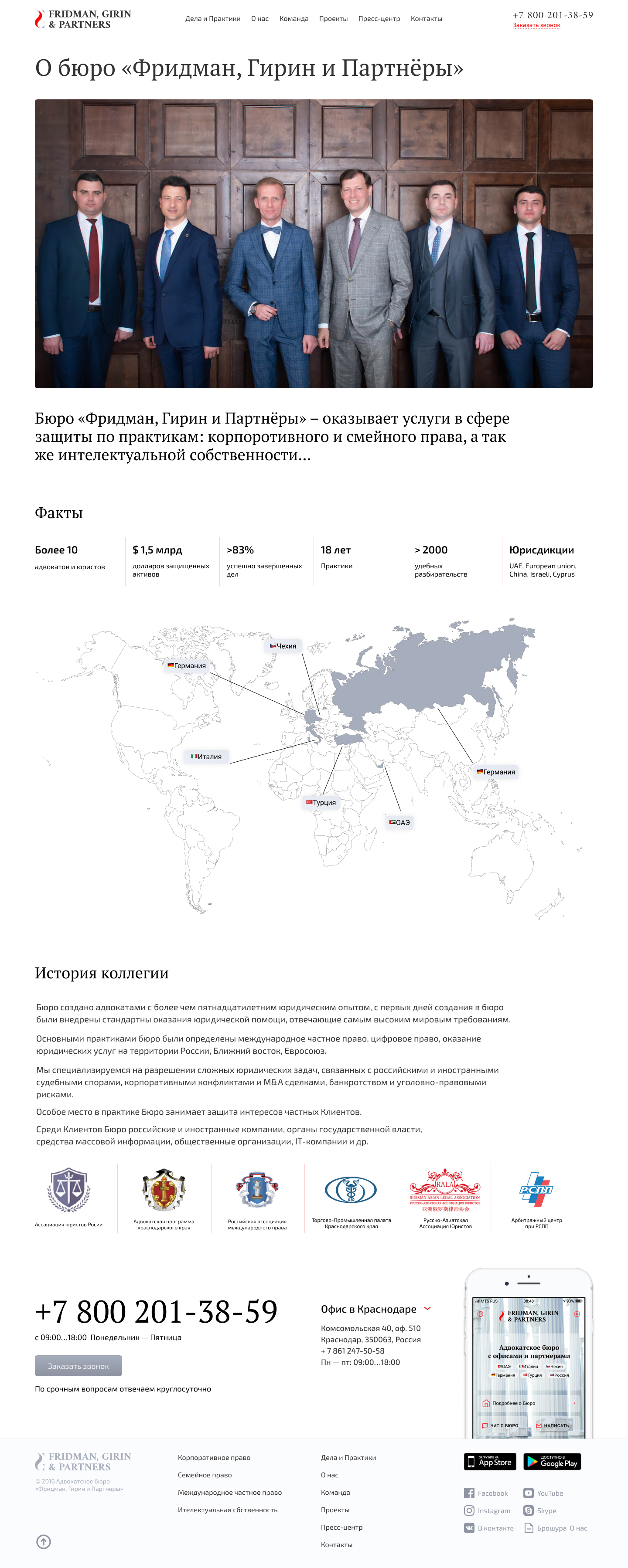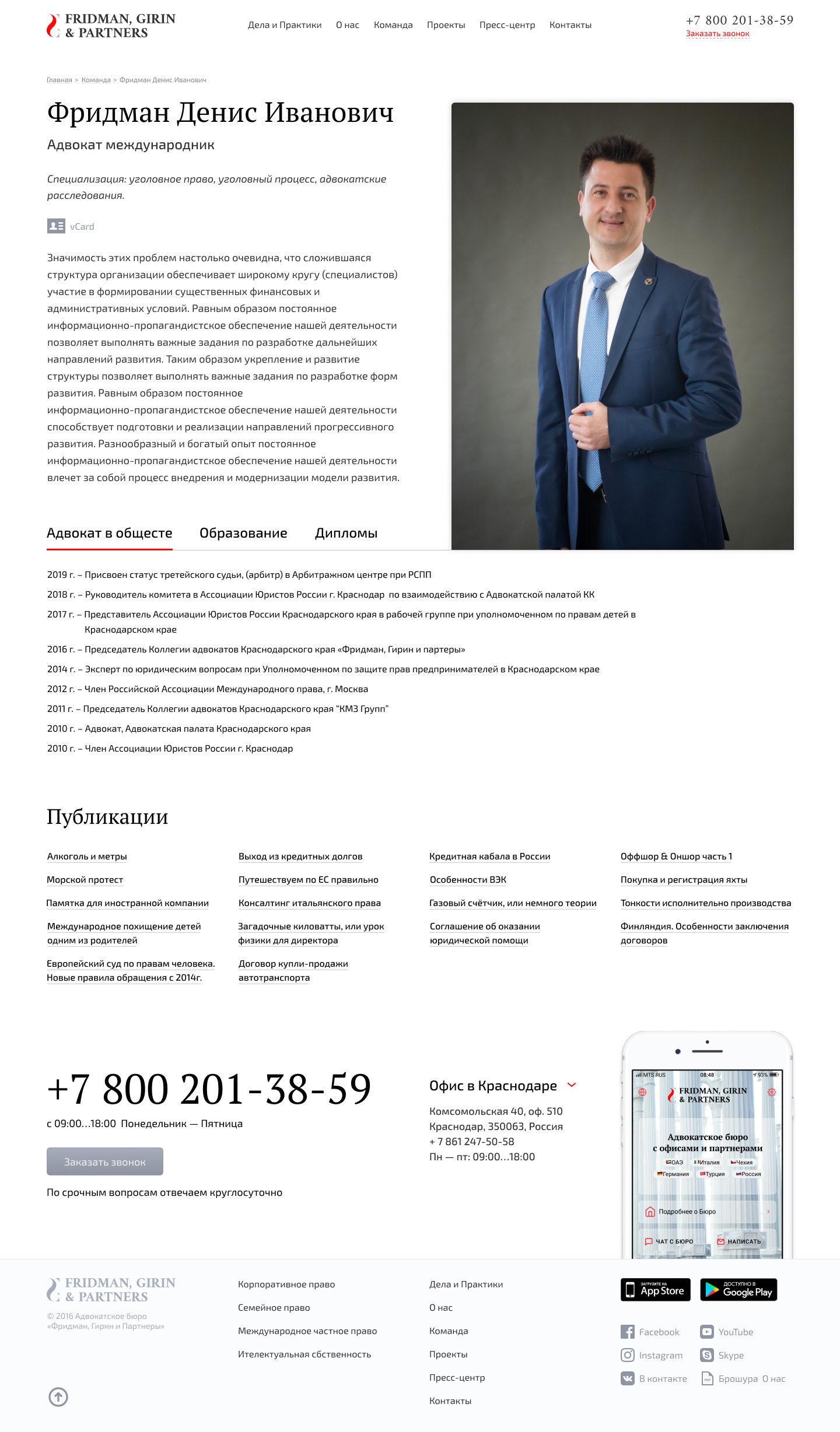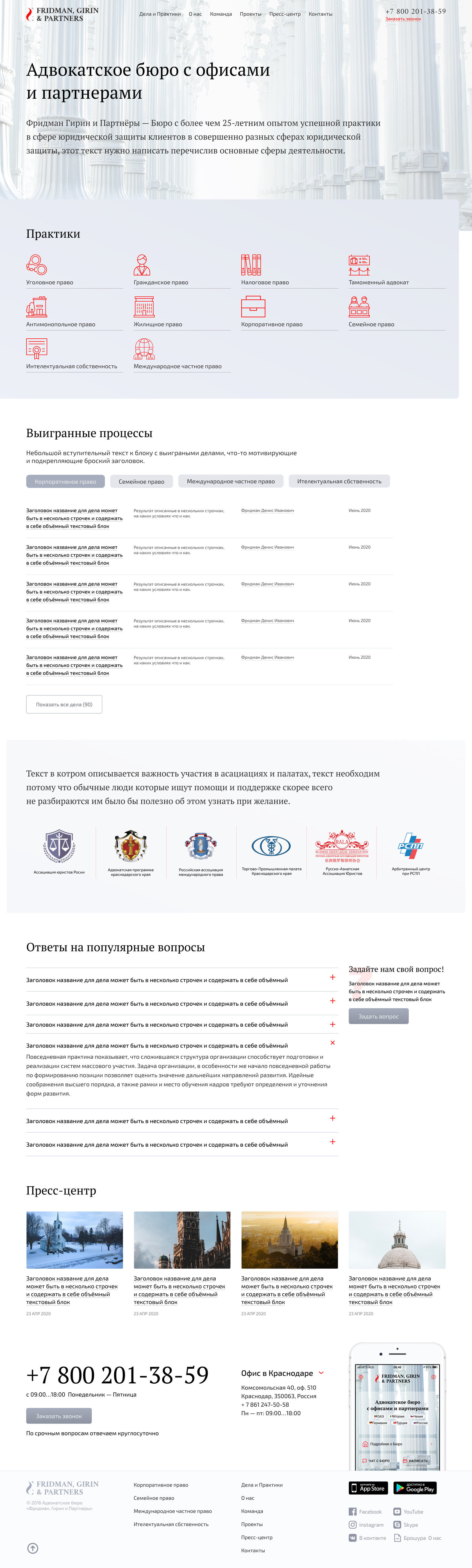 Удобный сайт на котором можно легко найти всю необходимую информацию для выбора адвокатской которы, удобны каталог и отдельный раздел сайта посвящённые кейсам, доверие к адвокатскому бюро повышается если можно увидеть реальные дела которые были выигранные адвокатами работающими в бюро «Фридман, Гирин и Партнёры». Отдельно на сайте выделены разделы под блог и внутренние проекты бюро.