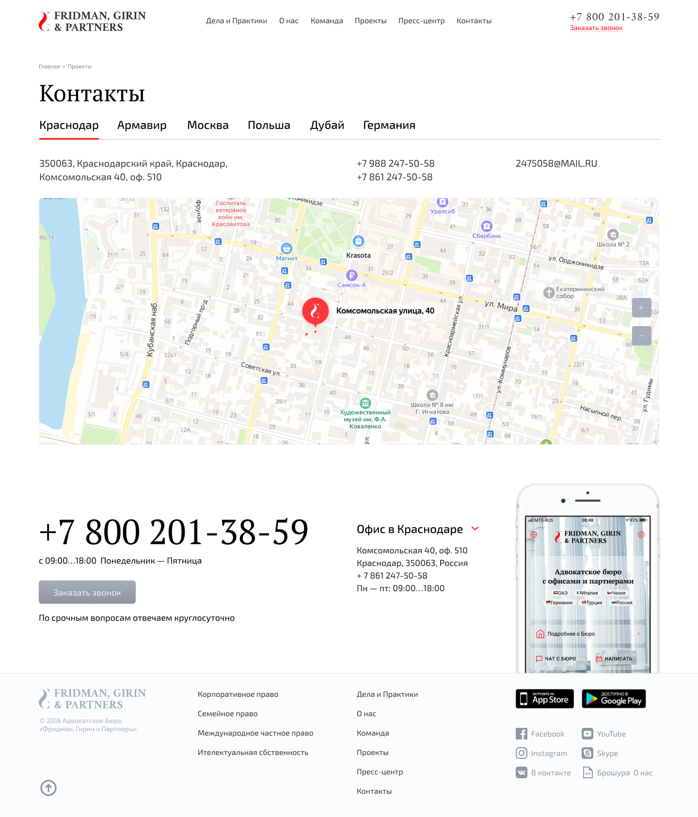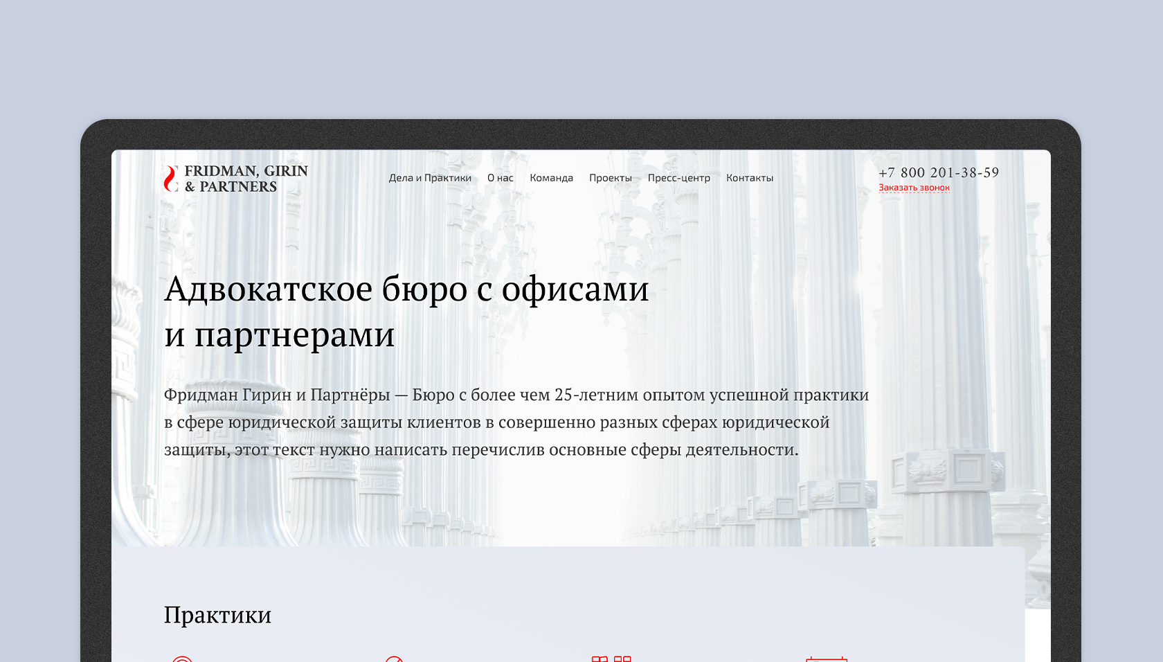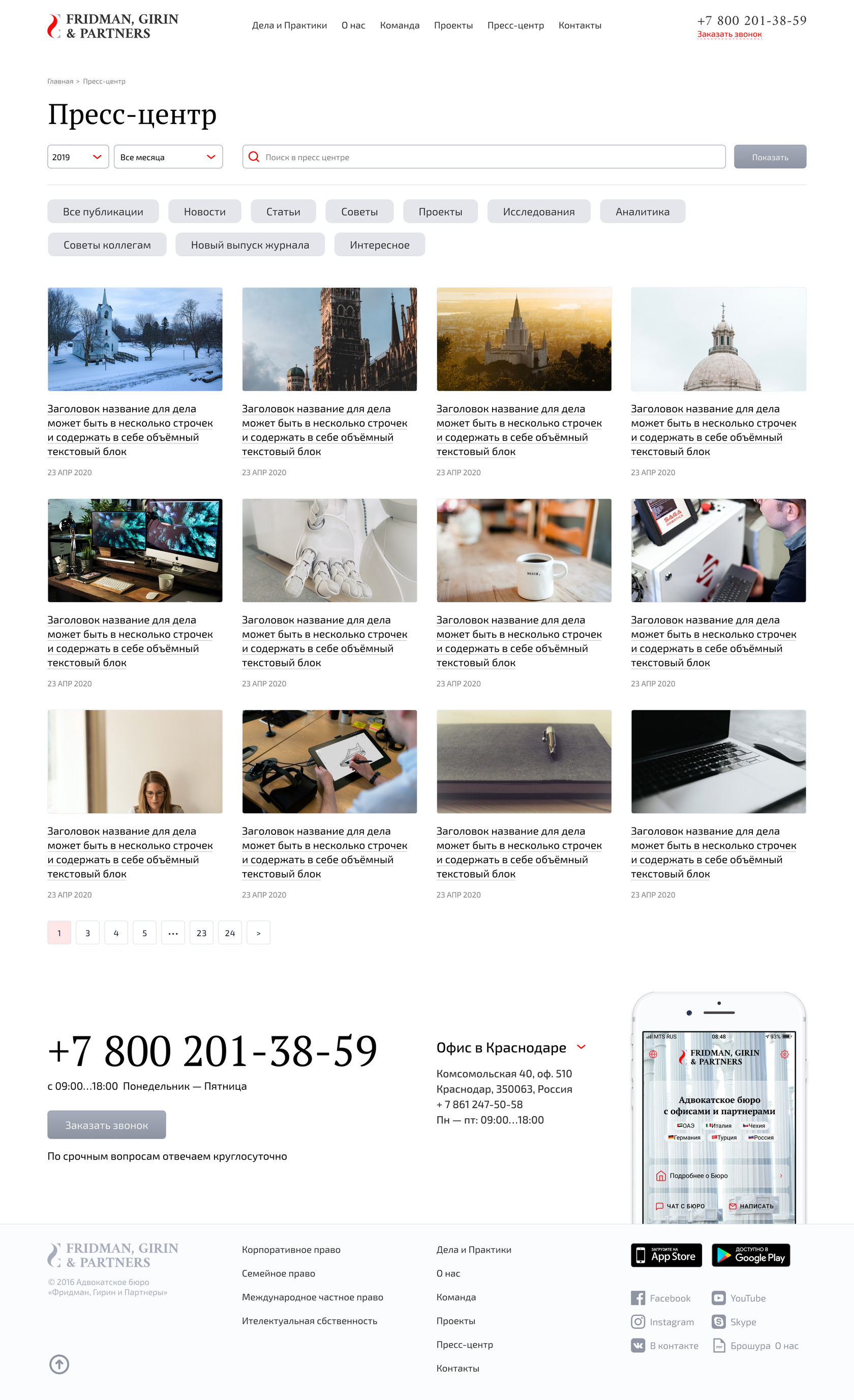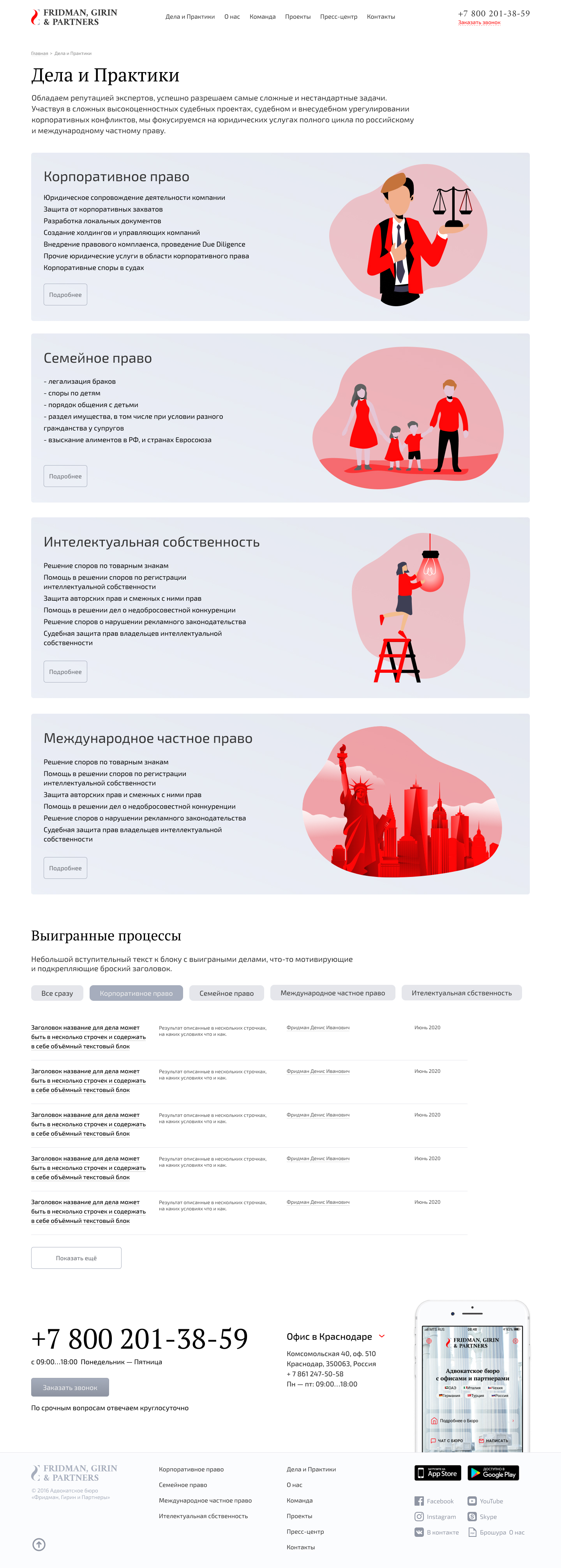 Удобный сайт на котором можно легко найти всю необходимую информацию для выбора адвокатской которы, удобны каталог и отдельный раздел сайта посвящённые кейсам, доверие к адвокатскому бюро повышается если можно увидеть реальные дела которые были выигранные адвокатами работающими в бюро «Фридман, Гирин и Партнёры». Отдельно на сайте выделены разделы под блог и внутренние проекты бюро.